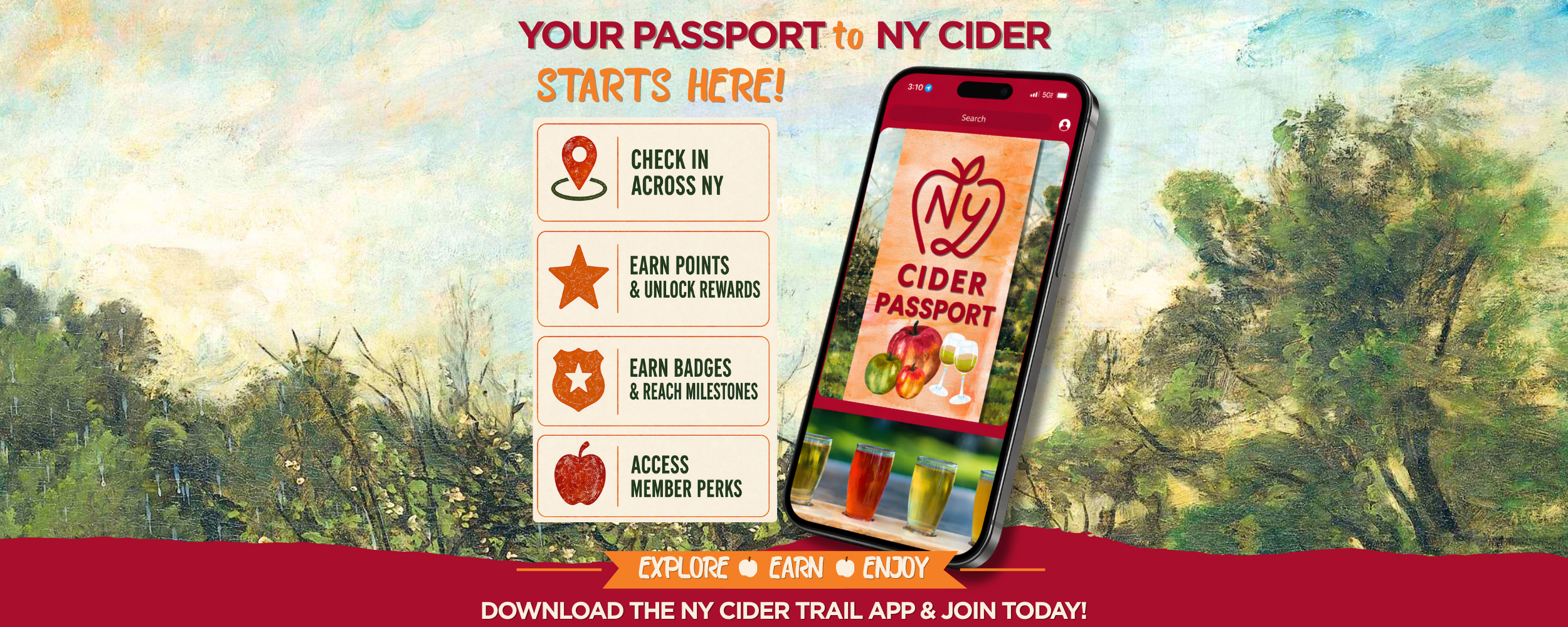 The New York Passport gives all New York Cider Association members exclusive access to an interactive, statewide discovery experience inside the NY Cider Trail app.